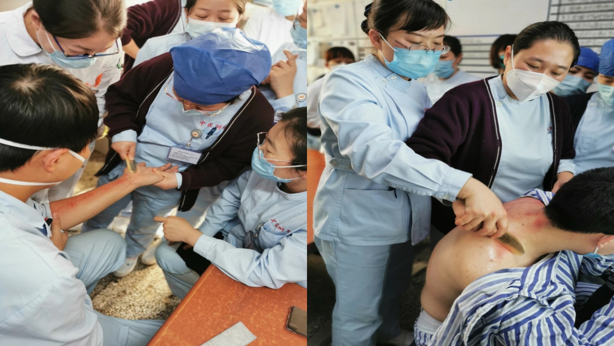 本期由中医护理骨干、皮肤科护士长魏珊珊培训推广中医特色技术--虎符铜砭刮痧。魏珊珊护士长结合经典案例从刮痧的基本要素、刮痧手法和注意事项等方面进行了详细的理论授课和实操培训。大家学习热情高涨,踊跃发问、积极动手,体验刮痧的功效,科研小组成员结合子午流注理论、音乐疗法、人体磁场等方面提出了见解和创新点。