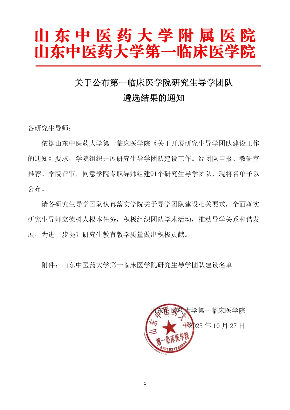 关于公布第一临床医学院研究生导学团队遴选结果的通知