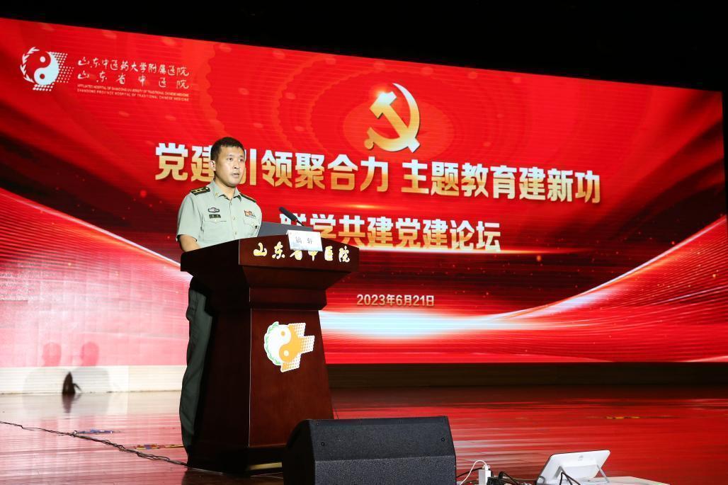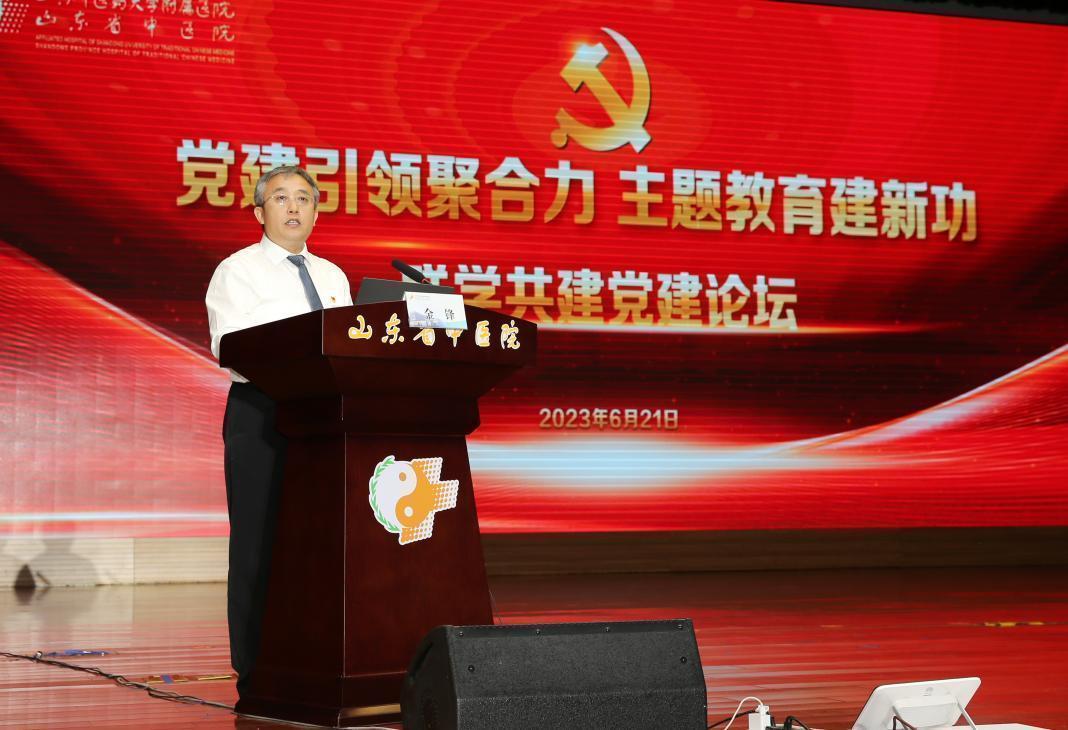 2023.06.21 来源部门:组织部在迎接中国共产党成立102周年来临之际,为深入推进学习贯彻习近平新时代中国特色社会主义思想主题教育不断向纵深开展,6月21日,由我院主办的学习贯彻习近平新时代中国特色社会主义思想主题教育联学共建党建论坛在千佛山院区举办,来自省市区相关各级党政机关、部队、院校、企业、乡村、街道社区等46家单位的专家领导及党务工作者齐聚一堂,共同探讨推进主题教育走深走实有效举措,交流新时代党建引领事业发展新思路新途径,合力打造优势互补、资源共享、协同创新、共同发展的党建工作新局面。医院党委书记金锋致辞,论坛开幕式由院长邓华亮主持,论坛展示交流环节由党委副书记李吉华主持。